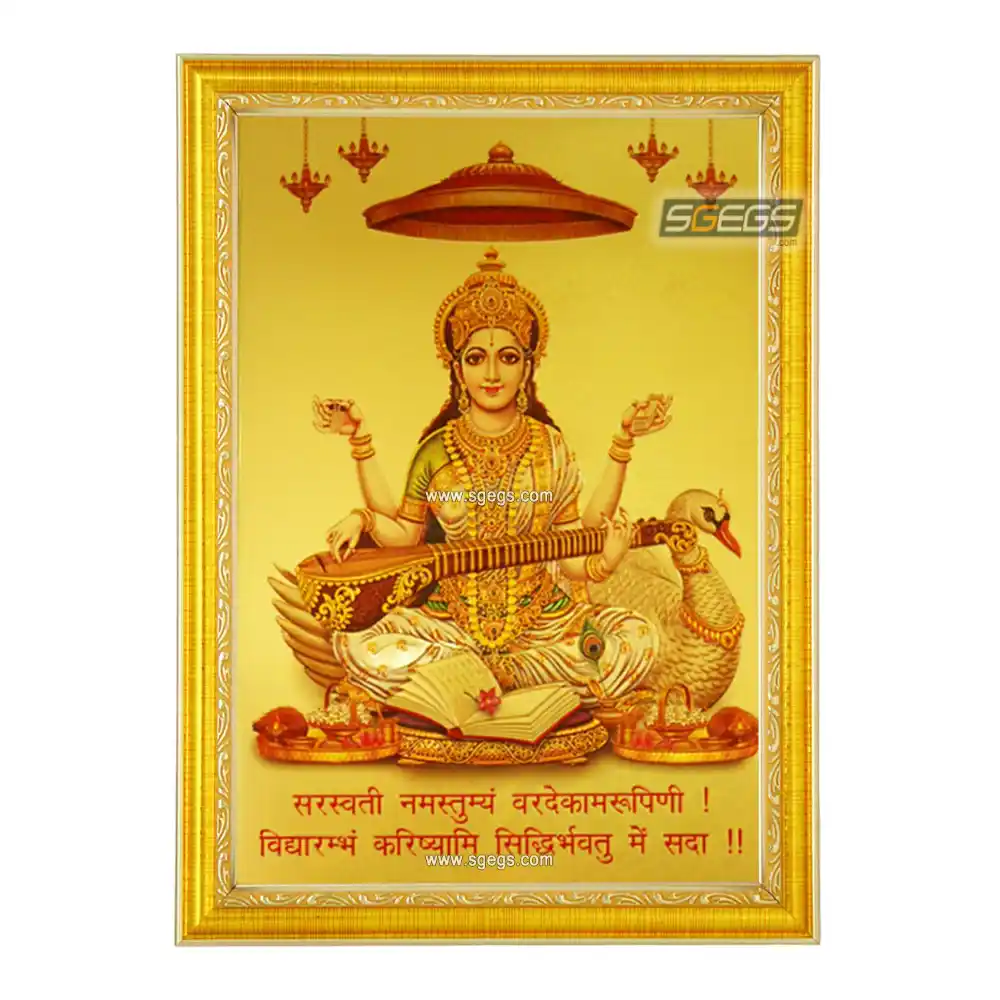 Goddess Saraswati Photo Frame with Mantra, Gold Plated Foil Embossed Picture Frame, Religious Framed Poster (SGEGS ID: 1015)